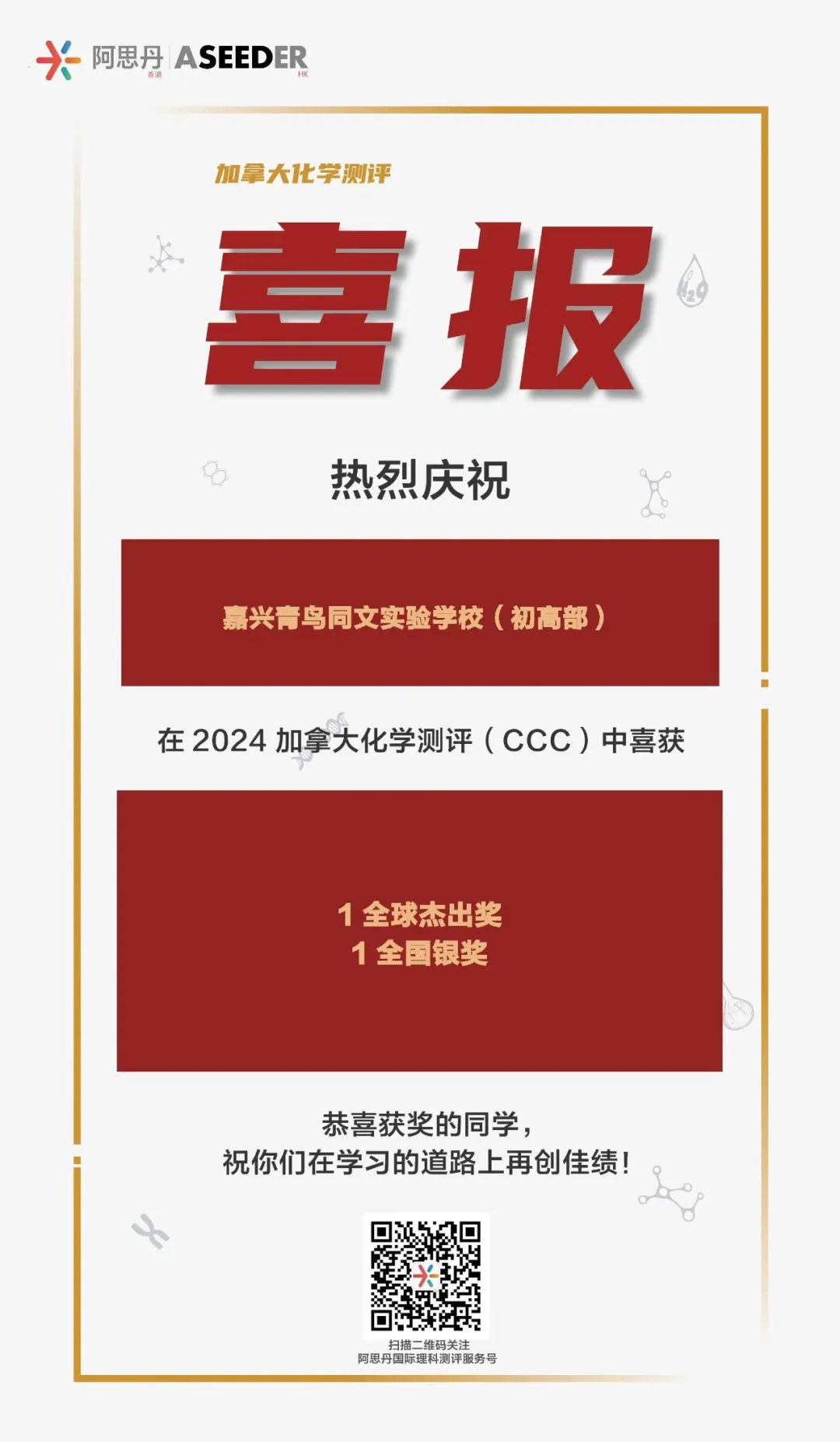 Congratulations to Joseph, a Grade 10 student in the Tongwen Division, on his success in the Canadian Chemistry Assessment (CCC) competition, and we hope that he will continue to ride the waves and thorns in the field of chemistry!