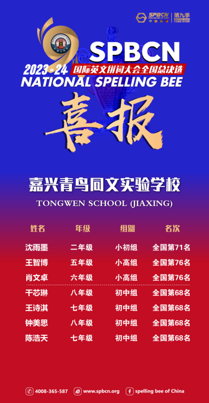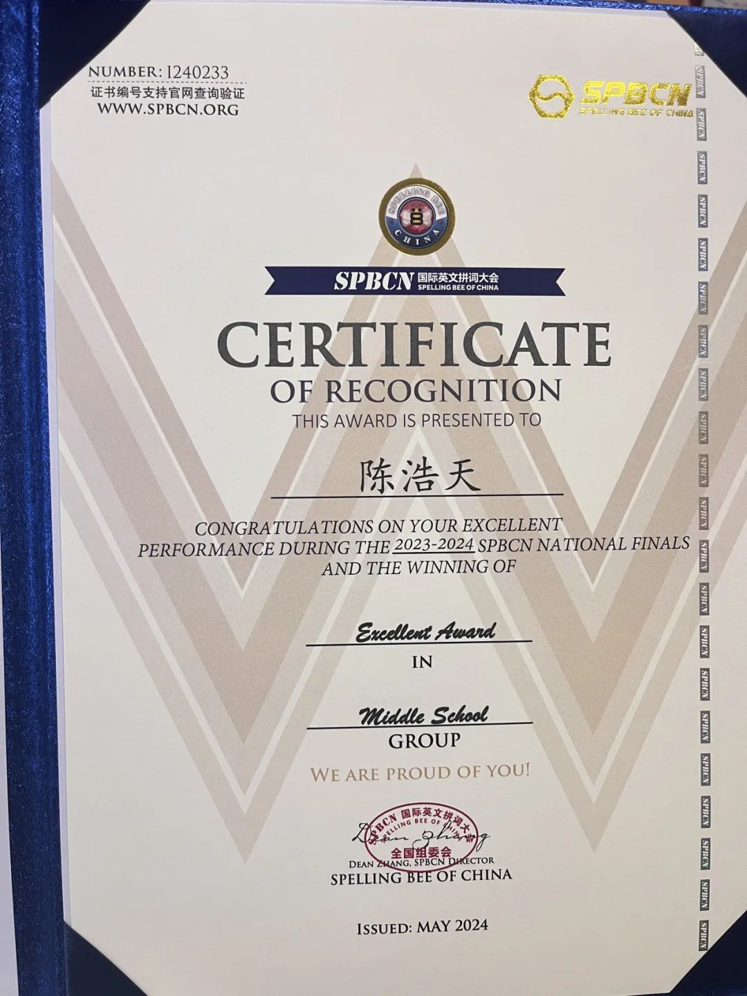 作為浙江省個人賽區(qū)派出選手最多的學(xué)校,我們有4名優(yōu)秀選手在五一期間前往北京參加了全國總決賽。在全國Spelling Bee個人賽初中組的百人角逐中,經(jīng)過多輪激烈競爭,我校的4名選手最終躋身全國68強,斬獲卓越獎項,為他們的學(xué)習(xí)生涯又增添了一枚重要的獎杯!